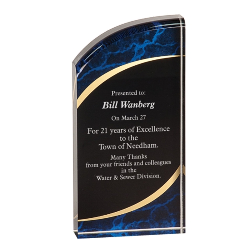 Rounded Marbelized Acrylics are 1" thick and self standing. This acrylic is great for all needs. Your custom logo can be added at no extra charge.