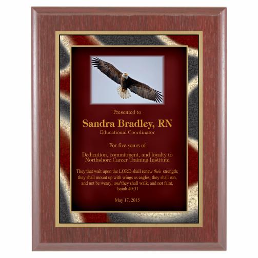 This is an economical plaque and is available in many sizes. Your custom logo or picture can be added at no extra charge. Plate designs, color and texture may vary.